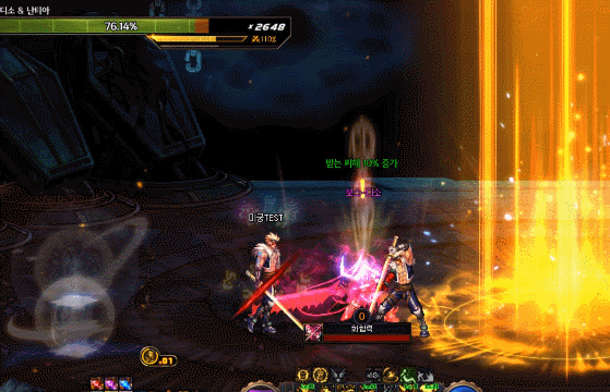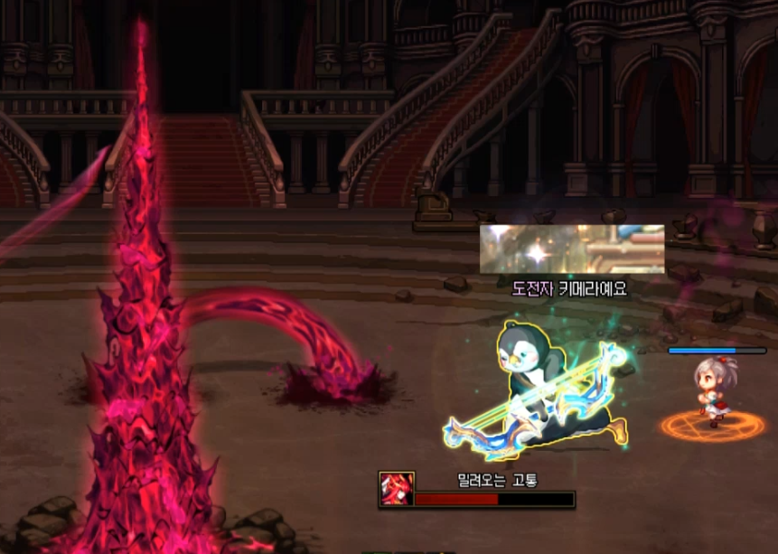 밀려오는 고통 패턴입니다. 피구슬을 먹으면서 버티다가 가운데 기둥이 올라올 때 기둥에 닿으면
