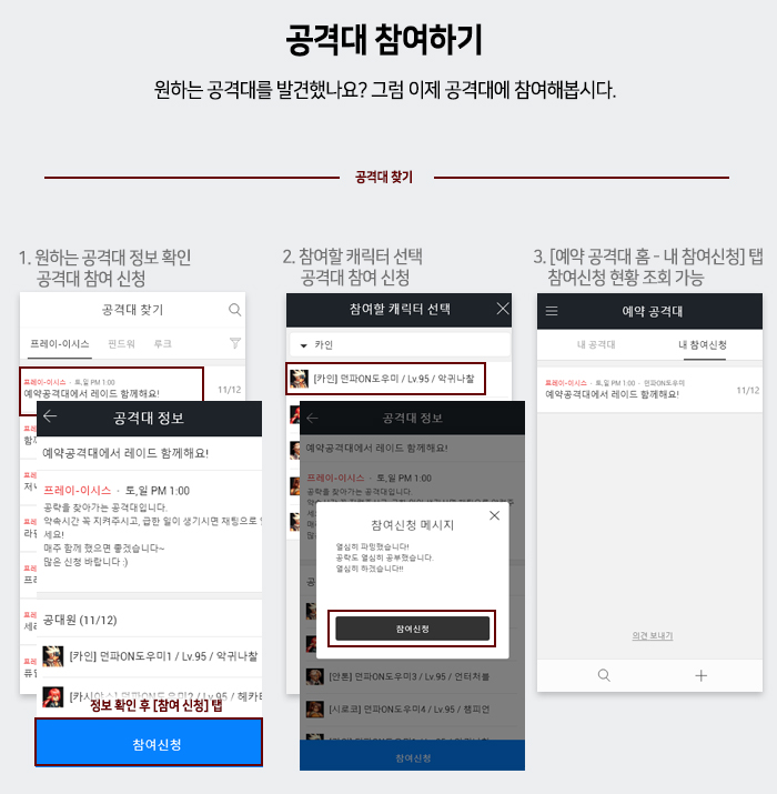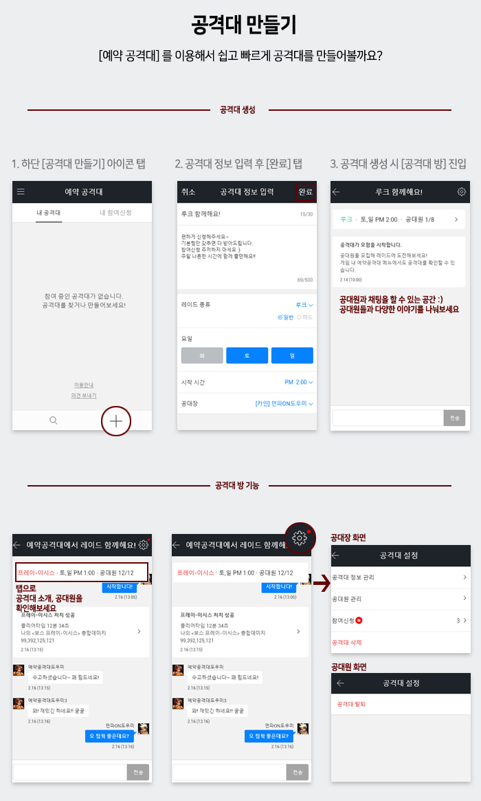 레이드 공격대를 찾는 방법부터 [예약 공격대] 의 다양한 기능을 하나씩 소개할게요.
