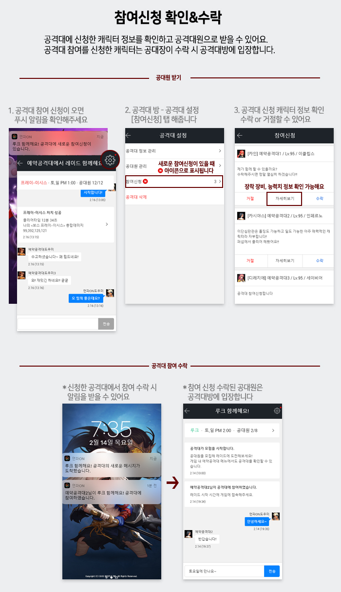 공격대를 만든 다음 공격대에 참여를 원하는 유저의 정보를 확인해서 공격대원으로 받고