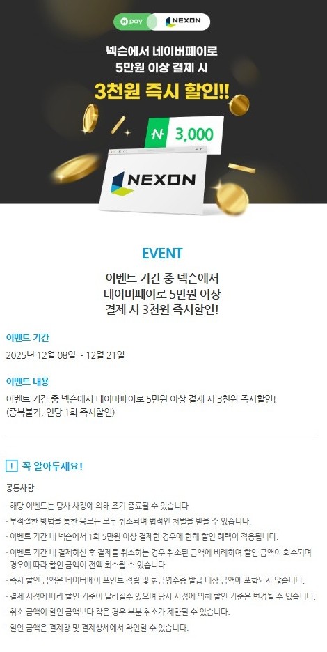 12월 8일(월)부터 Npay(네이버페이)로 1회 5만원 이상 넥슨캐시를 충전하면