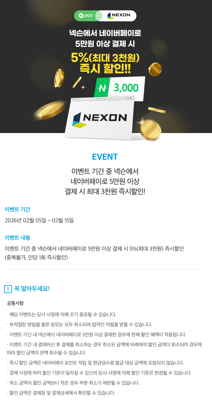 2월 5일(목)부터 2월 15일(일)까지 Npay(네이버페이)로 1회 5만원 이상 넥슨캐시를 충전하면