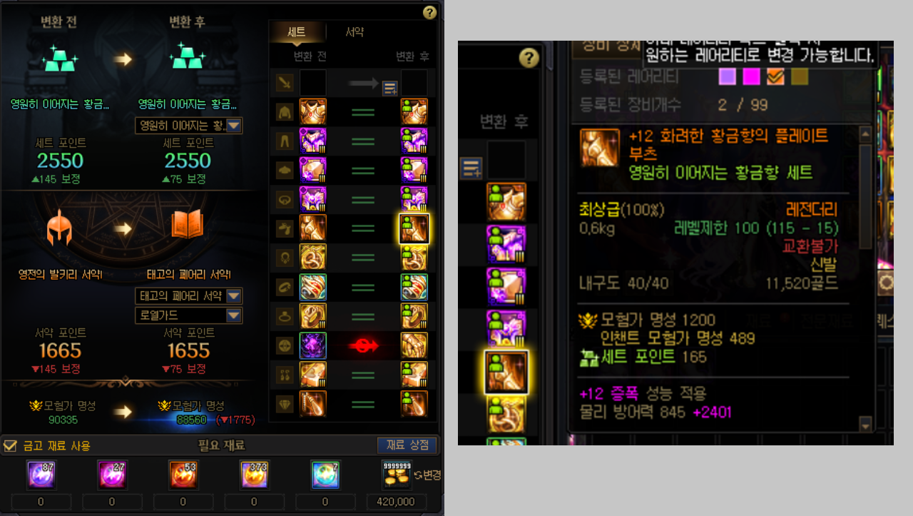 - 무기고 탭에서 세트 장비가 고유 장비보다 등급이 더 낮을 경우, 상위 등급의 고유 장비가 자동적으로 노출되며 변환 시 고유 장비로 변환함.