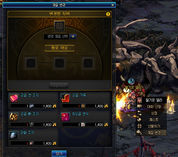 마계 지역 암시장의 딸기코 델라의 NPC 메뉴 중 재질 변경 메뉴를 통해 방어구의 재질을 변경할 수 있습니다.
