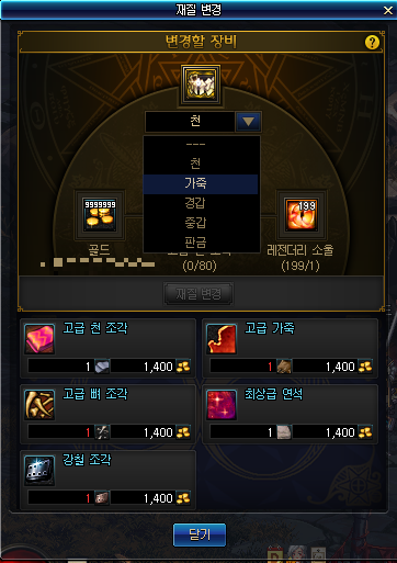 95레벨 이상의 방어구는 재질 변경이 가능합니다.(예: 가죽 → 중갑)