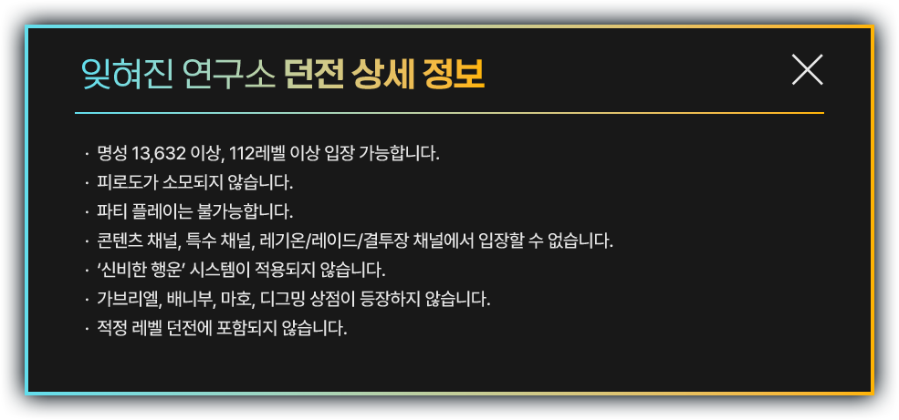 - 잊혀진 연구소 던전은 명성 13,632 이상 / Lv.112 이상 캐릭터만 입장할 수 있습니다.