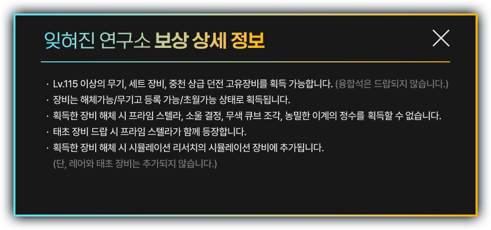 - 잊혀진 연구소 던전에서는 Lv.115 이상의 무기, 세트 장비, 중천 상급 던전 고유장비를 획득할 수 있습니다. (융합석은 드랍되지 않습니다.)