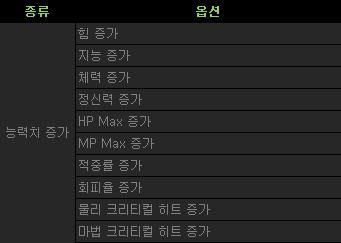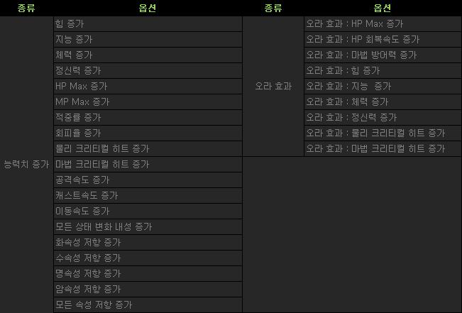 * 장비 부위마다 적용 되는 옵션은 아래와 같습니다.(아래 표를 참고)