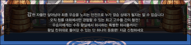 * 무투장의 게임 진행은 16강 토너먼트 1:1 대전 형식으로 진행됩니다.