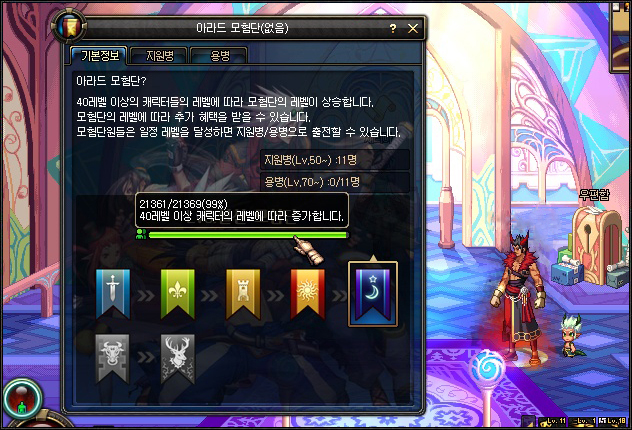 * 동일 계정/동일 서버내 40레벨 이상 캐릭터들의 레벨에 따라 모험단의 경험치와 레벨이 상승합니다.