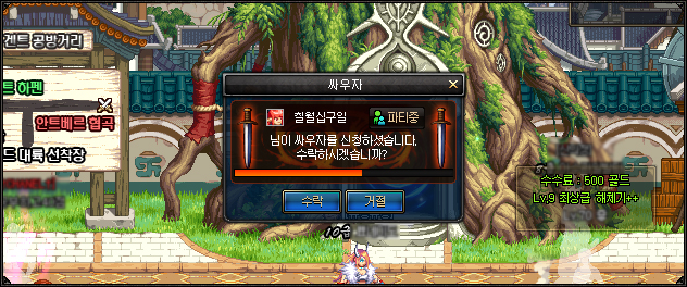 - 싸우자를 받은 캐릭터가 파티 중일 경우, 해당 파티의 파티장에게 싸우자 제안창이 등장합니다.