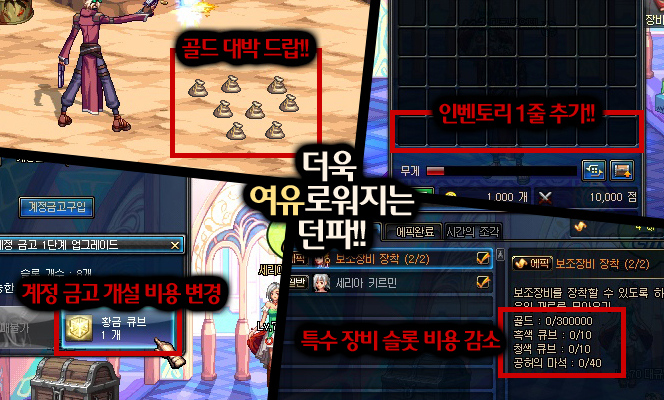 「부담스러웠던 특수 장비 슬롯 개설 비용을 줄어들고, 골드 드랍량이 늘어나게 됩니다.」