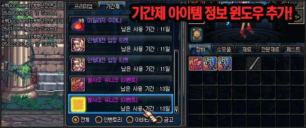 - 인벤토리/금고에 있는 아이템중 기간제 아이템의 남은 기간을 표시하는 윈도우가 추가됩니다.