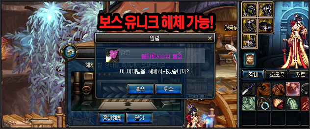 「대전이로 인해 추가된 신규 던전에 맞는 보스 유니크가 새롭게 등장하고, 해체 기능이 추가됩니다.」