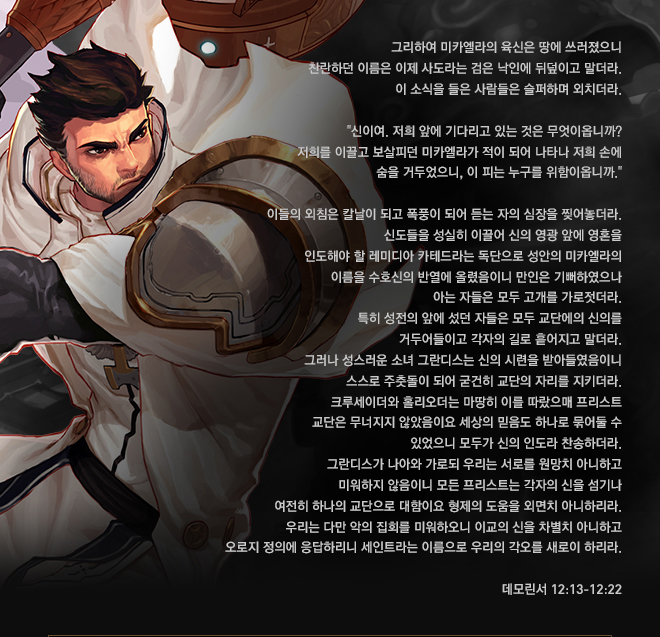 아군에게 성스러운 빛의 가호를 내려 일시적으로 방어력을 올리고 주위 적에게