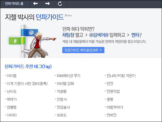 * 던파 가이드(Beta)가 적용됩니다. 이제 게임 내 명령어(@검색어@ 혹은 #검색어#)를 입력하거나, 메뉴(esc) 화면에서