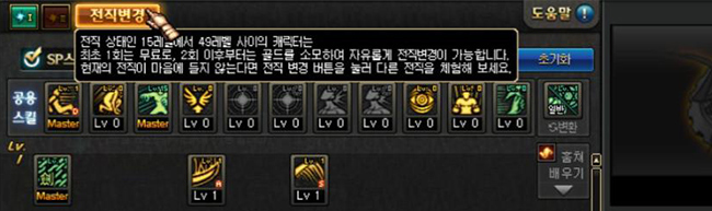 * 전직 상태인 15레벨 이후 부터 49레벨 사이의 캐릭터는 각 전직별로 최초 1회는 무료로, 2회 부터는 골드를 소모해 자유
