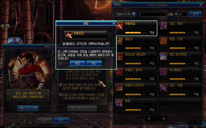 - '에픽조각 선택' 클릭 후 에픽 도감에서 원하는 에픽 아이템의 에픽조각을 선택할 수 있습니다.