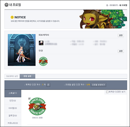 · 내 프로필 메뉴에서 프로필에 보여질 캐릭터와 인장을 설정할 수 있습니다.