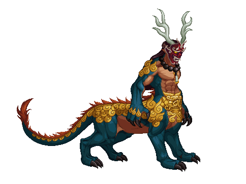 형태 : 상체는 인간의 모습을 하고 있고 사족 보행을 하는 마수. 가슴과 배를 제외한 신체의 대부분이 비늘로 덮여 있다. 주로 지상에서 활동하지만 비늘과 꼬리는 물속에서 움직이기에도 적합하게 발달되어 있다. 발견 당시부터 에컨 양식의 장신구들을 착용하고 있었다.