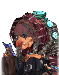 암시장에 있는 상인 중 한 명. 약간의 마법적 지식과 잘 맞지 않는 카드 점에 의지하여 지금껏 살아왔다.