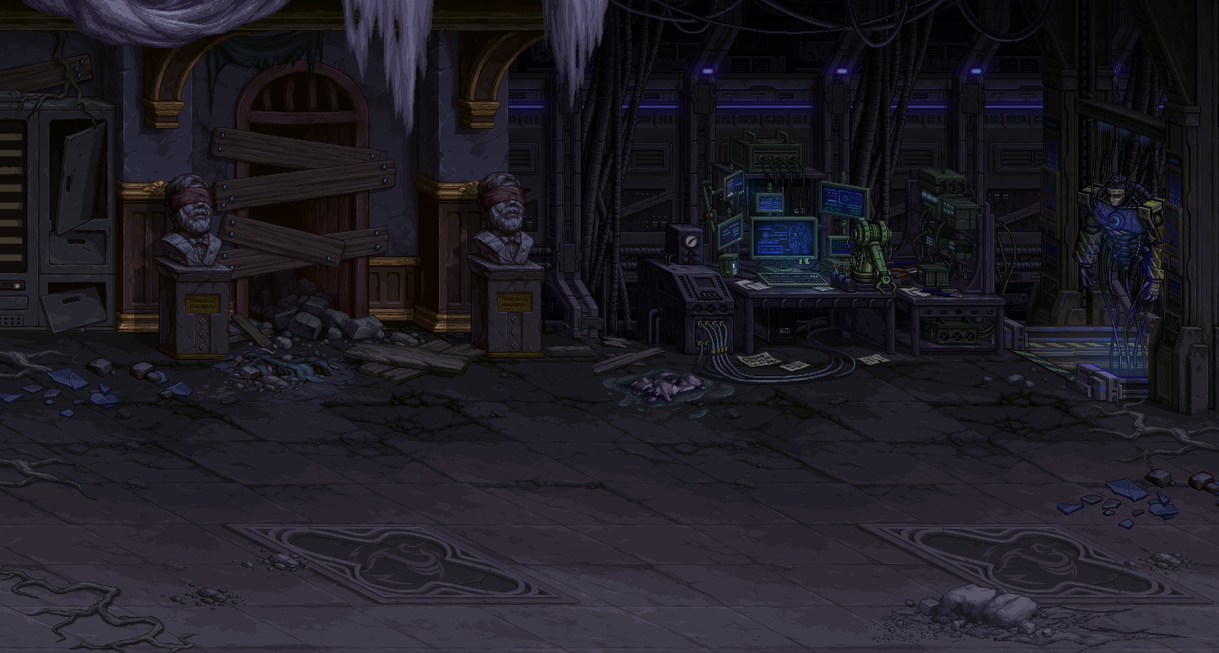 현재는 정체 불명의 기계들과 그 사이에 매장되듯이 널브러진 무언가의 잔해들이 곳곳에 널려있다.