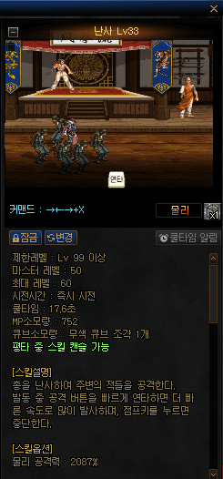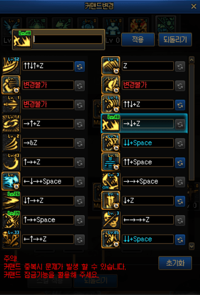 · 스킬 커맨드 키 입력 시 중복 검사를 하며, 중복되는 키가 없는 경우 적용 버튼을 통해 커맨드를 확정할 수 있습니다.