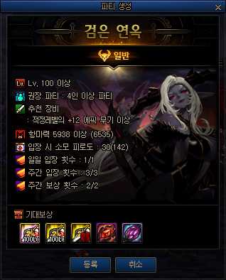 | 100Lv 에픽 장비 | 던전 클리어 결과 보상에서 일정 확률로 획득할 수 있습니다. |