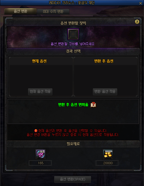 클리어 리워드에서 일정 확률 획득 | 강력한 힘이 응축된 집결체. 레미디아 크리소스 : 황금의 제단에서 에픽 장비의 옵션 변환 재료로 사용된다. <변환 옵션>의 수치를 최대 수치로 변환시킬 수 있다. |