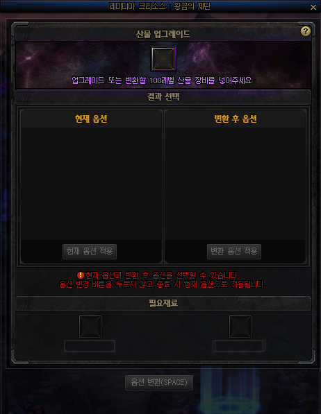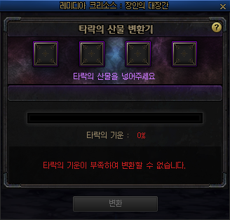 | 파멸의 기운 1개 | 절망의 광석 30개 | 절망의 광석을 정화할 때 흘러나온 부정한 것을 응축한 기운. 100레벨 지혜/타락의 산물을 업그레이드 하는데 사용된다. |