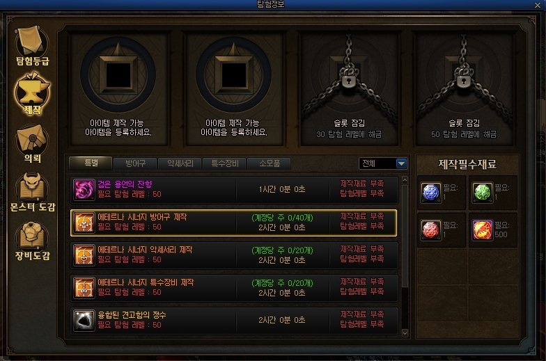 | 5단계 장비[레전더리] | 에테르나 하드 보스 몬스터를 사냥하고 얻은 재료를 통해 제작할 수 있습니다. |