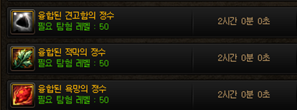 | 8세트 | 던전 입장 시 파티원이 2명 이상인 경우 아래의 효과 발동 - 상태이상에 걸린 적 공격 시 10초동안 자신을 제외한 파티원들이 네임드, 보스 몬스터를 공격 시 적이 받는 피해 증가 - 적이 걸린 상태이상 종류 수에 따라 8% → 6% 씩 증가 (최대 16% → 12% 증가) |