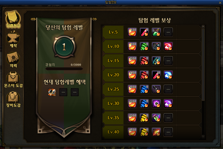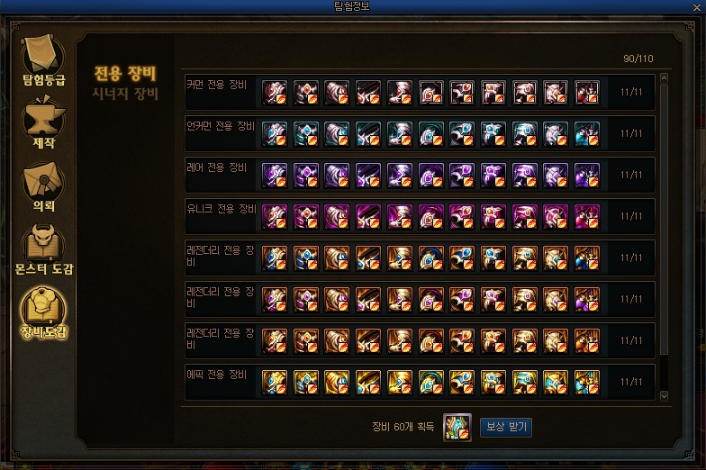 | 4단계 장비[유니크] | 3단계 장비와 특정 몬스터 재료를 통해 업그레이드할 수 있습니다. 4단계 장비는 에테르나 하드 보스 몬스터를 사냥할 수 있는 수준의 장비입니다. |