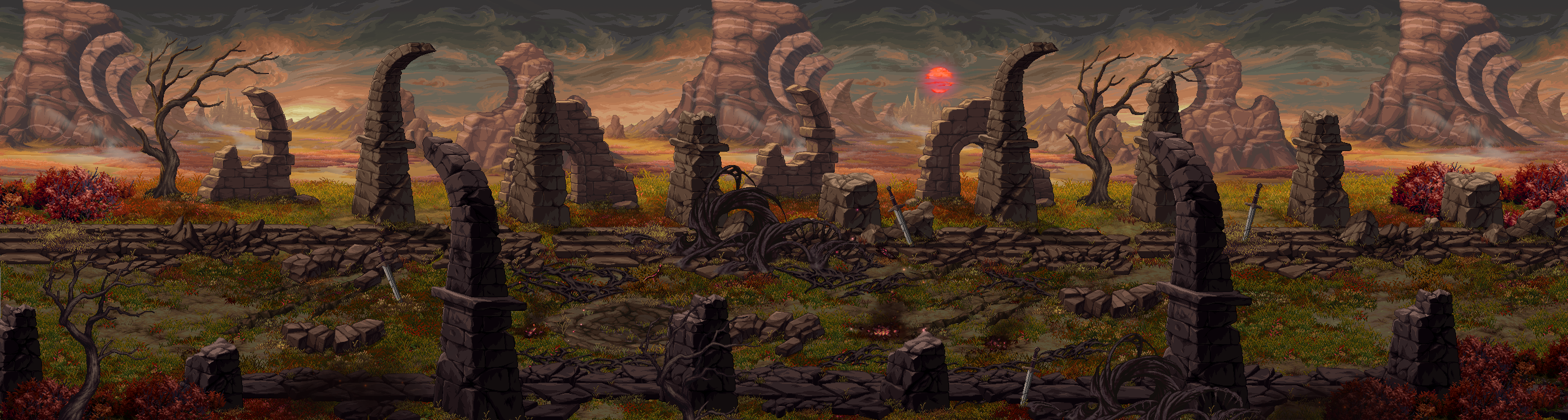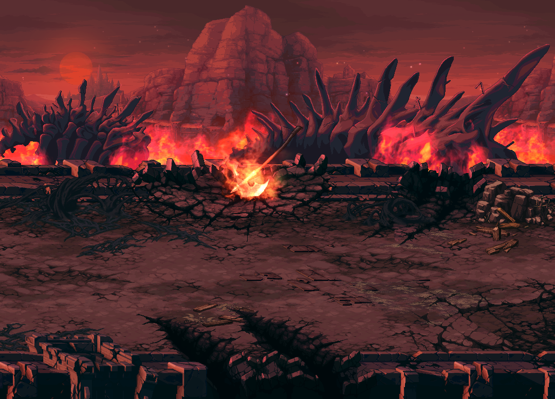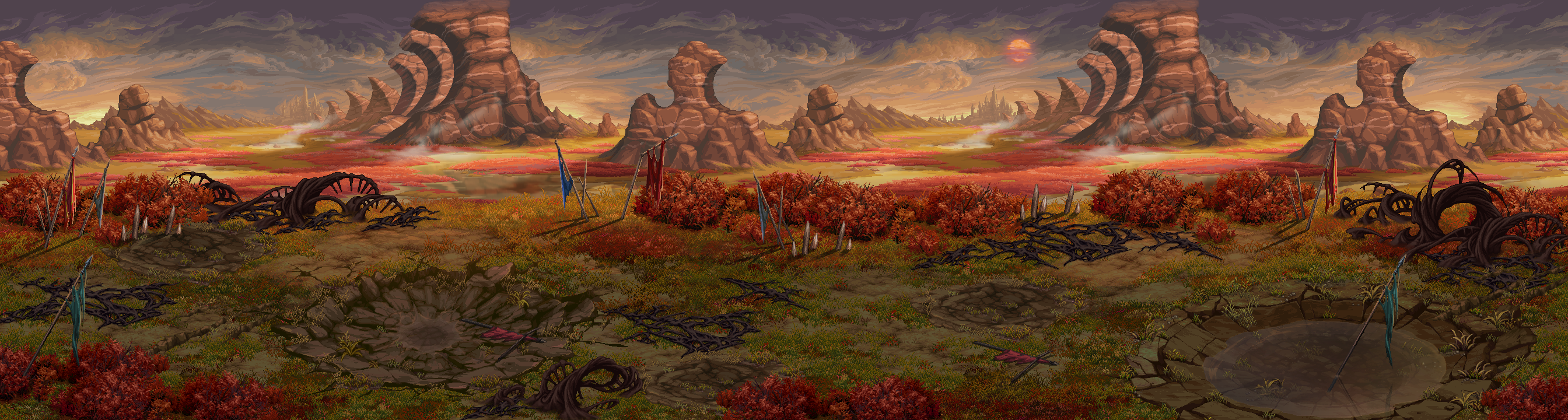 하지만 검은 성전이 발발한 이후에 황폐한 대지로 변모하였고, 붉은 피가 물든 파멸의 평원이라 불리게 된다.