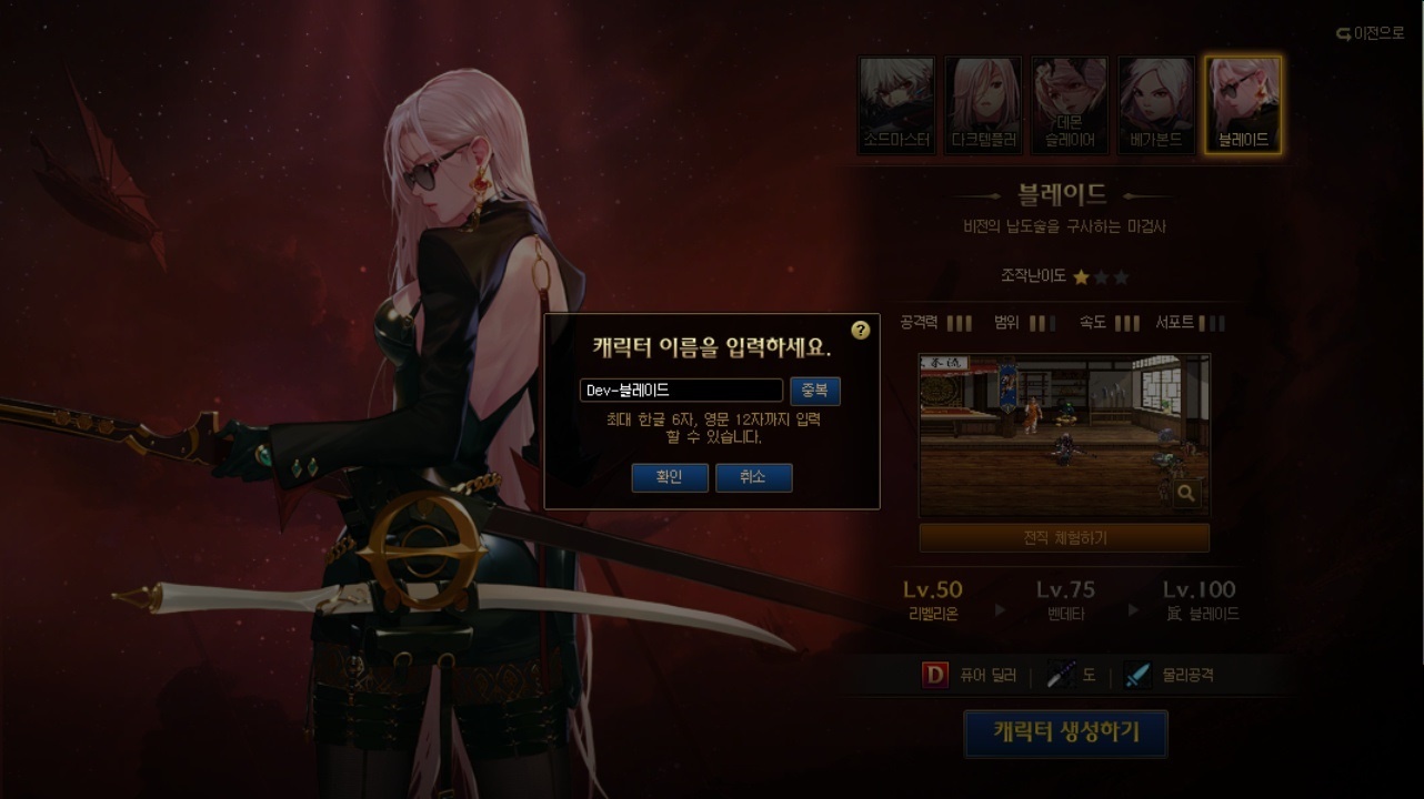 - · 캐릭터 생성 : 클릭 시 캐릭터 이름 입력창이 팝업되고, 캐릭터 이름 입력을 완료하면 체험 중인 전직으로 캐릭터가 생성됩니다.