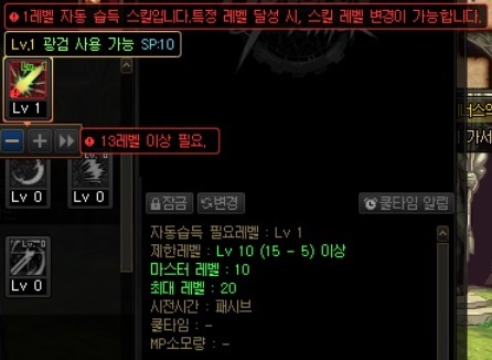- · 자동습득 필요레벨은 달성했지만 습득 제한레벨을 충족하지 않는 경우 스킬 레벨을 조정할 수 없으며, 스킬 아이콘에 마우스 오버 시 안내 문구가 출력됩니다.