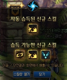 - · '스킬창 열기'와 '닫기' 버튼이 추가되고, '닫기' 버튼 클릭 또는 'ESC'키 입력으로 알림창을 닫을 수 있습니다.