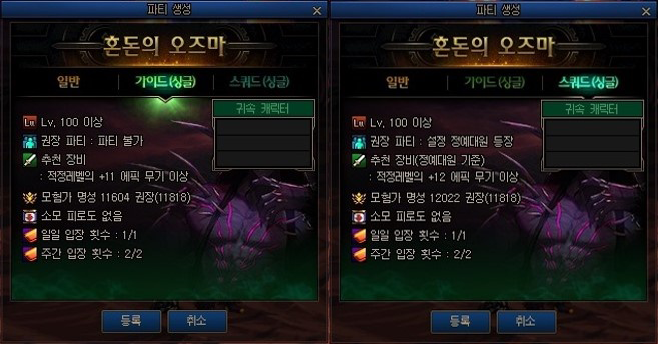 | 공격대 | 다음 보상 중에서 각 확률에 따라 1종을 획득할 수 있습니다. · 혼돈의 원념 9개 · 혼돈의 원념 10개 · 혼돈의 원념 11개 · 혼돈의 원념 12개 · 혼돈의 원념 16개 · 혼돈의 원념 9개 + 파멸/공포/절망의 문양 중 1종 · 혼돈의 원념 12개 + 절규하는 혼돈의 원념 12개 · 혼돈의 원념 9개 + 오즈마 유니크/레전더리 몬스터 카드 중 1· 종 · 혼돈의 원념 9개 + 오즈마 에픽 장비(파멸,절망,공포,희생,성화) 중 1종 · 혼돈의 원념 9개 + 지혜의 인도 신화 장비 중 1종 |