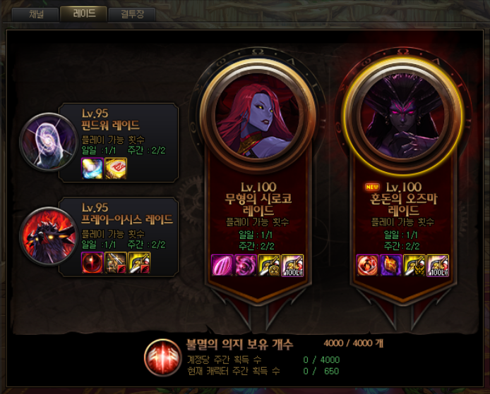 특수/레이드 콘텐츠에서 어떤 아이템을 획득할 수 있는지는 직접 플레이 하기 전에는 알 수 없는 불편함이 있었습니다. 이런 부분을 보완하고 플레이 동기를 강화하기 위해 획득 가능한 보상을 쉽게 알 수 있도록 채널 선택 화면에서 콘텐츠별 대표 보상을 바로 확인할 수 있도록 하였습니다.