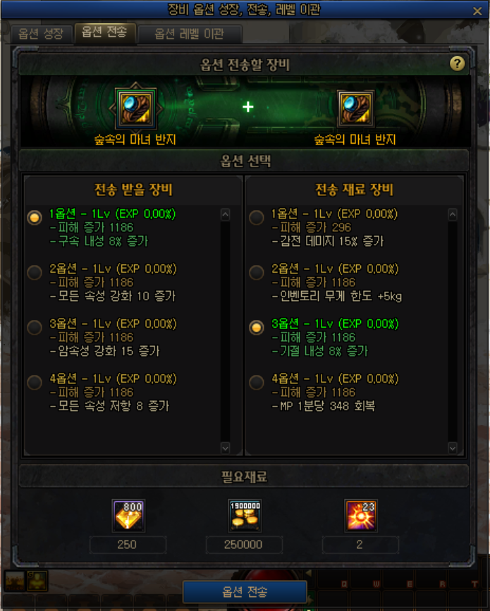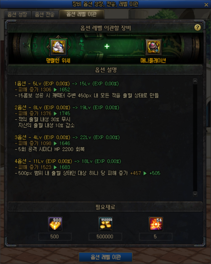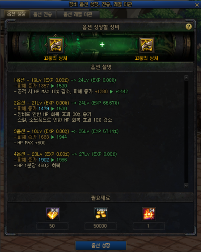 105Lv 장비를 어느 정도 성장시킨 시점에서, 다른 세팅으로 변경하고 싶을 때 이용할 수 있도록 옵션 레벨 이관 시스템을 추가하였습니다.