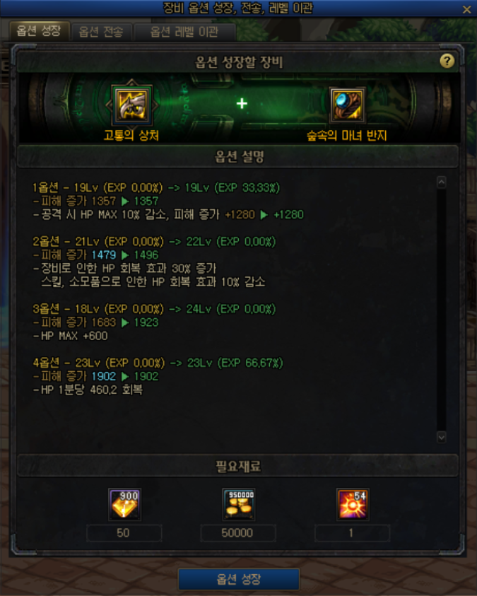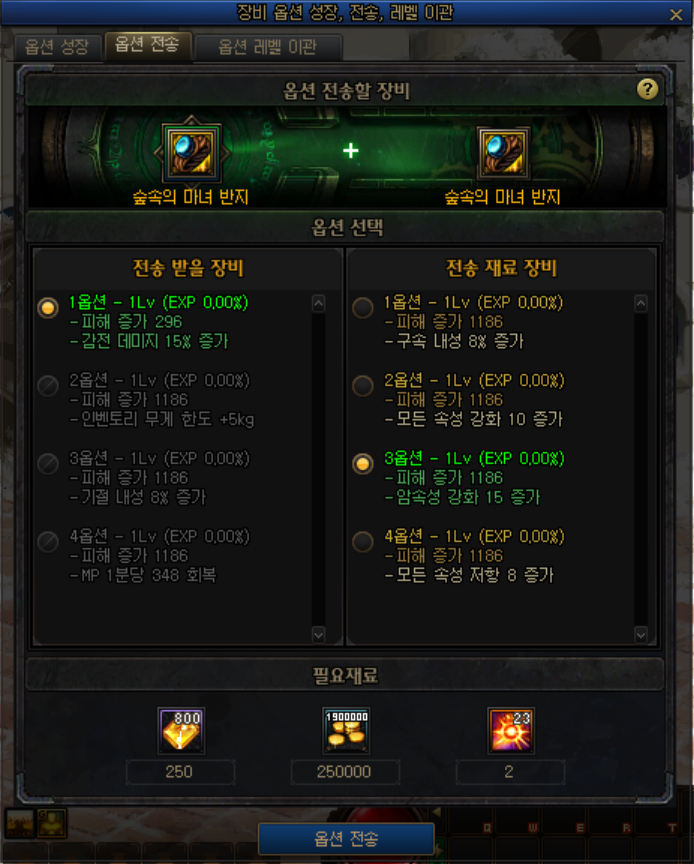 | 옵션의 종류가 다르지만, 재료 장비의 경험치와 레벨을 그대로 이관받을 수 있습니다. |