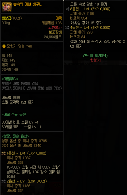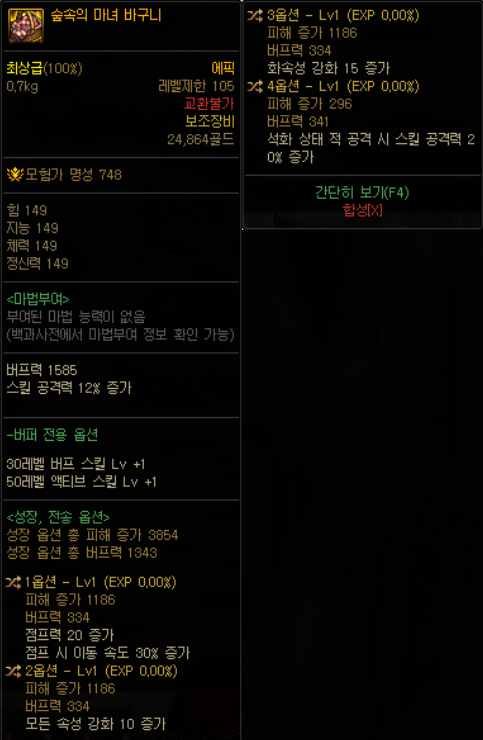 | 105Lv 레어 장비 | 마법봉인 형태의 장비이며, 기존 레어 장비와 다르게 별도의 데미지 증가 옵션(피해 증가) 및 버퍼 전용 옵션(버프력)을 가지고 있습니다. 세트 옵션이 존재하지 않으며, 던전 플레이를 통해 획득할 수 있습니다. 교환 가능 속성의 아이템만 존재합니다. |