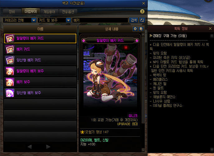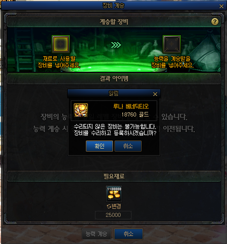 | 보조장비 | 골드 150,000 흑색 큐브 조각 1000개 청색 큐브 조각 1000개 | 골드 100,000 흑색 큐브 조각 50개 청색 큐브 조각 50개 |