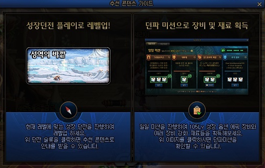 - · 1~109레벨 캐릭터 중 현재 진행할 수 있는 액트 퀘스트가 없을 경우 추천 콘텐츠 가이드가 노출됩니다.
