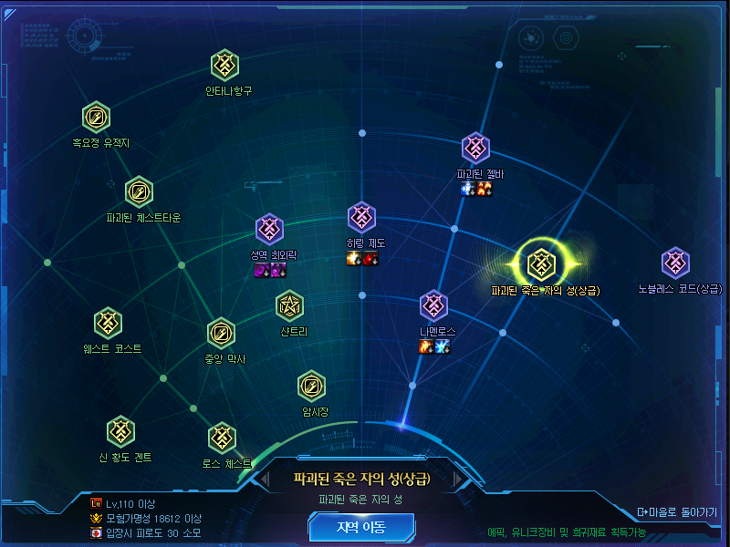 - · 지역 슬롯을 클릭하면, 해당 지역에 있는 던전의 이름과 레벨 제한 / 입장 명성 / 피로도 / 획득 가능한 아이템의 간략한 정보를 확인할 수 있습니다.