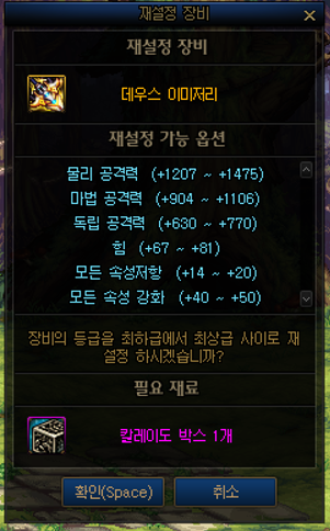 - · 칼레이도 박스/해방된 칼레이도 박스 사용 시 재설정 가능한 옵션 및 옵션의 최대/최소값이 표기됩니다.