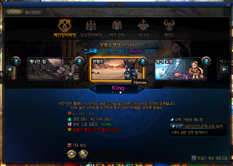 - · 현재 캐릭터의 명성을 기반으로 진행 가능한 난이도를 추천합니다.