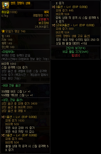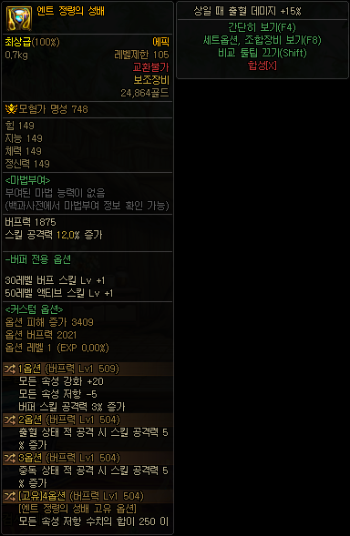모든 속성 강화 +20 모든 속성 저항 -5 [버퍼 전용옵션] 버퍼 스킬 공격력 3% 증가 |
