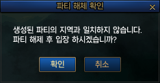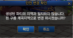 - · 다른 지역의 파티가 생성된 상태로 던전 입장 시도 시, 던전 변경 확인 팝업창이 출력 되며 확인 시 현재 위치에 맞는 파티 정보로 즉시 변경할 수 있습니다.