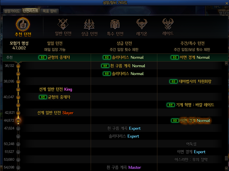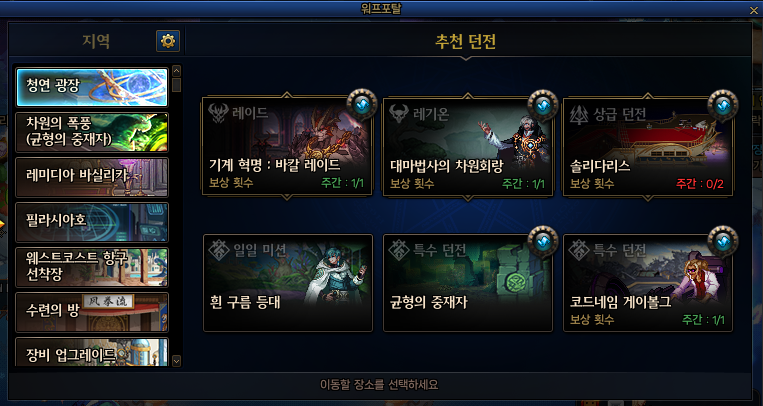 워프 포탈 - 추천 던전 리스트에서 상급 던전의 경우, 캐릭터 명성에 따라 '흰구름 계곡'과 '솔리다리스'가 변경되어 출력 되고 있습니다.