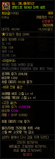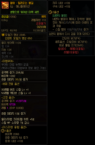 버프력 2066 최종 데미지 5% 증가 물리/마법 방어력 +10,000 공격 시 HP/MP 1% 회복 (쿨타임 3초) |